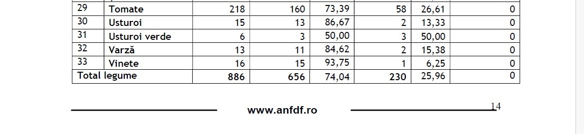 din 2.550 probe de legume analizate, în 1.778 (69,7%) probe nu au fost depistate reziduuri de pesticide, 744 (29%) probe au avut reziduuri de pesticide cu valori sub limita maximă admisă (probe conforme) și 28 (1,09%) probe neconforme, cu valori ale reziduurilor de pesticide peste limita maximă admisă ( LMA ), reprezentate de: tomate – 7 probe, ceapă verde – 5 probe, spanac – 4 probe, salată – 2 probe, mărar- 2 probe, pătrunjel frunze – 2 probe, ardei – 1 probă, fasole păstăi – 1 probă, gogoșari – 1 probă, ţelină cu frunze – 1 probă, ţelină rădăcină – 1 probă și vinete – 1 probă).