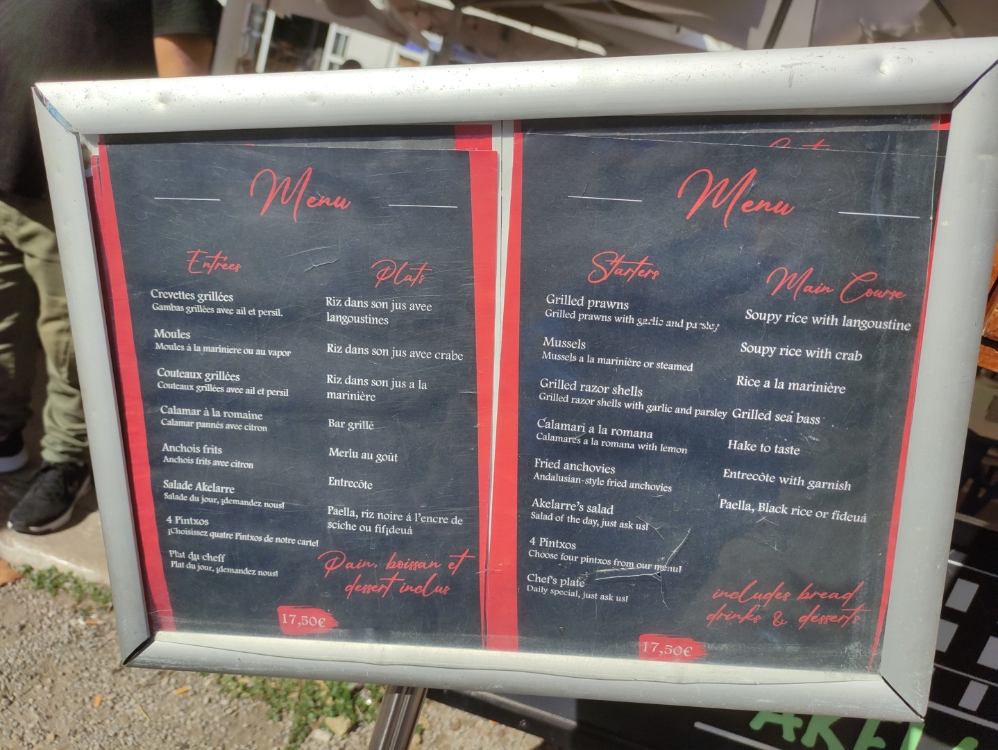 Cum pe lângă acest meniu am dorit și cartofi bravas (cartofi prăjiți catalani cu sos picant) am plătit, pe lângă costul meniurilor încă 10 euro. Și s-au adăugat și 2 euro pentru cutii, căci nu am putut termina tot și am luat la pachet.