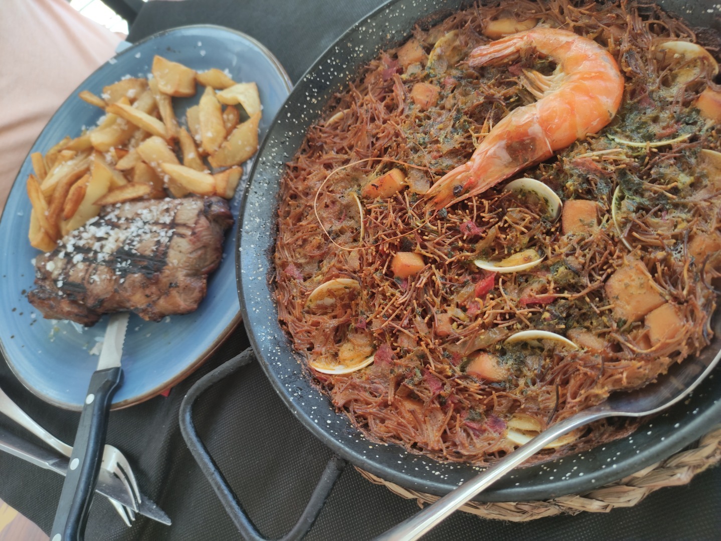 Pentru felul principal el a preferat o friptură (da, aveau și un fel cu carne pentru mofturoși), iar eu fideua, o paella cu fidea și fructe de mare (crevete, sepie și scoici almejas).
