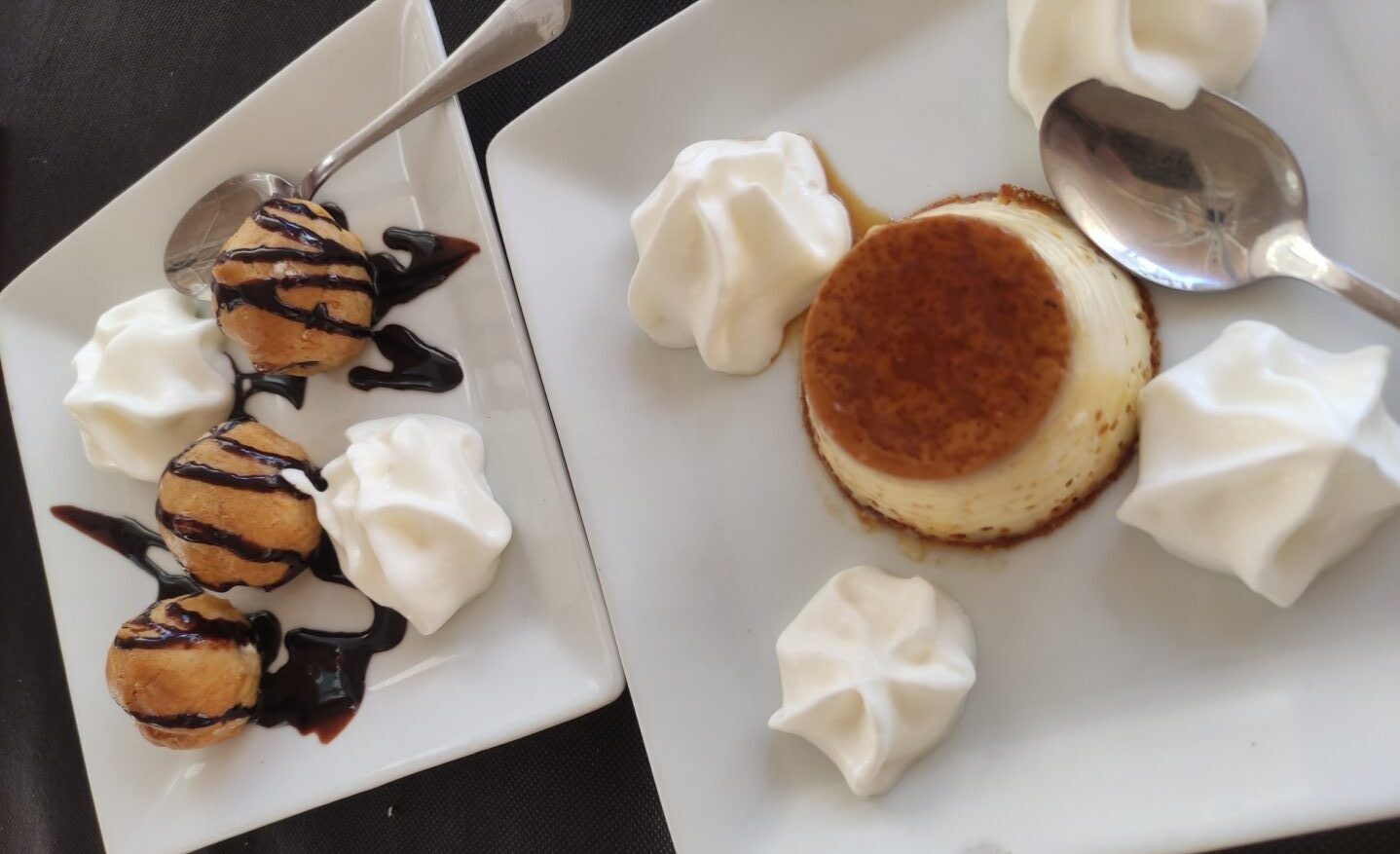 La desert am ales un flan (crema de zahăr ars) și profiteroles (un fel de chou a la creme umplut cu frișcă).