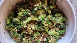 Garniturile pentru friptură se fac din toate legumele de sezon. Prietena mea a preferat, pe lângă piureul traditional din cartofi, să mai facă o garnitură de morcovi, cu celebrul sos de unt cu ierburi aromate și broccoli în sos de unt și tăvălit în migdale tocate.