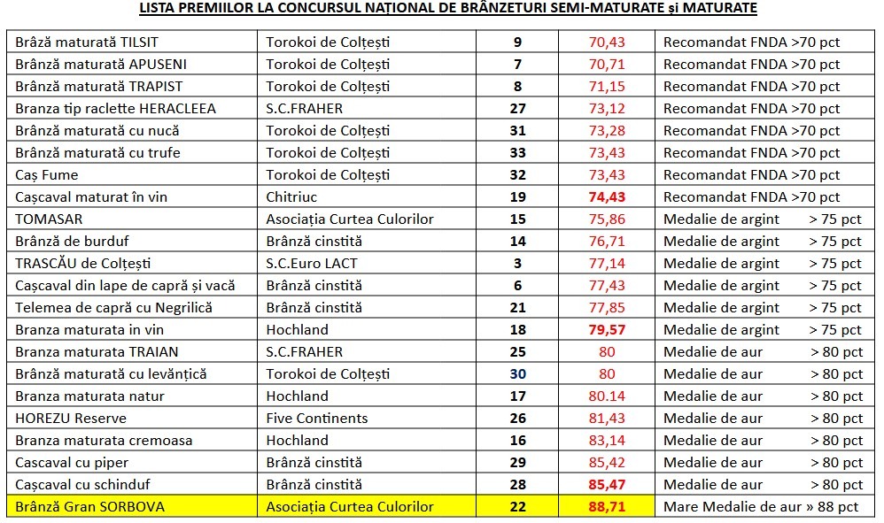 Notarea produselor a fost făcută după o grilă de punctaj europeană și o singură brânză a depășit 88 de puncte, valoare de la care se acordă Marea Medalie de Aur: Brânza Gran Sârbova produsă de Asociația Curtea Culorilor din Timiș.
