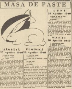 Chiar și în timpul celui de-al Doilea Război Mondial, masa de Paști era nelipsită din ziare. Timpul scria în 1940 despre cum ar trebui să arate o masă de Paști și dădea câteva sugestii derețete.