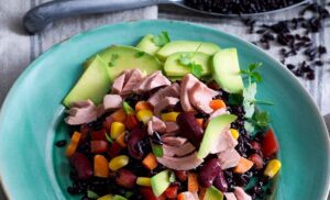 Salata de ton cu amestec de legume mexican, orez negru și avocado