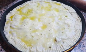 Aluatul obținut se împarte în două jumătăți egale și se întind două foi subțiri și rotunde – aceste cantități sunt potrivite pentru o tavă de 28cm diametru, ies de grosimea potrivită.