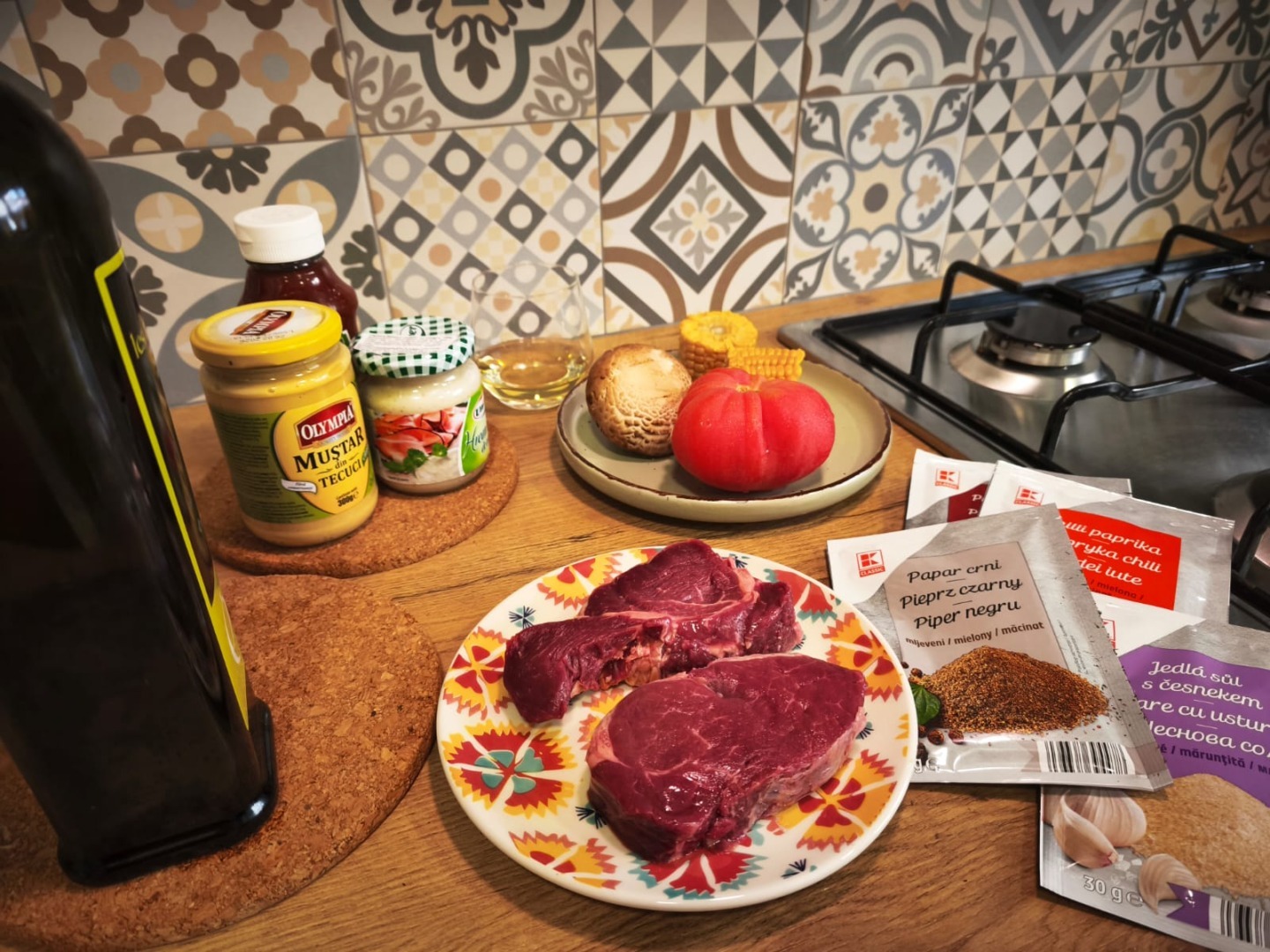 Bucățile ideale sunt antricotul, vrăbioara, mușchiul sau ribeye. Se taie în felii groase de 2,5–3 cm, pentru ca interiorul să rămână suculent chiar și după rumenire intensă la exterior. Am luat carnea tot de la Kaufland, proaspătă de la raionul de carne.