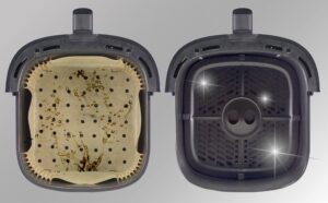 La ce ajută exact hârtia de copt în air fryer? În primul rând, împiedică ca grătarul și cuva lui să se murdărească, scutindu-ne de muncă în plus. În al doilea rând, ajută să creăm o suprafață cu mai puține spații, pe care putem așeza mai multe tipuri de alimente decât a fost conceput inițial acest aparat electrodomestic, mai exact preparate în stare semilichidă sau compoziții mai moi.
