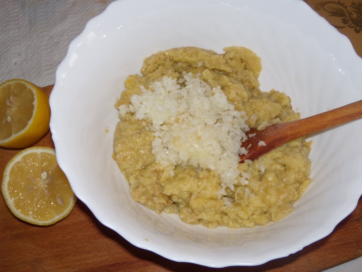 Continuați prepararea salatei de vinete în felul următor: Tăiați o ceapă mică cât de fin puteți. Ceapă albă. Puteți folosi și ceapă verde. Puneți ceapa peste vinetele tocate și amestecați cu o lingură sau cu un tel mai mic, turnând ulei în fir foarte subțire, ca și la… maioneză. Verificați dacă mai trebuie sare. Bateți bine de tot salata, va acumula aer și se va albi și mai mult. Puteți face salată de vinete cu ardei copt tocat, cu brânză fină dată pe răzătoare, cu nucă rasă sau cu…caviar. Folosiți la servire pâine moale de casă și roșii sau, o combinație deosebită, ardei copți. Dacă vreți să impresionați un străin, serviți-l cu salată de vinete cu ardei copți făcuți acasă, cu sosul clasic (ulei, oțet, usturoi, sare, zahăr).