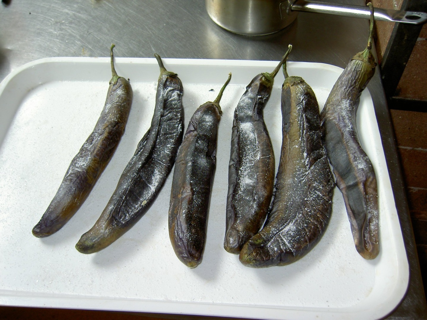Cum prăjim/coacem vinetele? Cel mai bine este dacă le prăjiți pe grătar. Se poate și pe o tablă, afară, la foc. Puteți să prăjiți vinetele și pe aragaz, dacă folosiți pe flacără o tablă mai groasă. Încingeți foarte bine tabla, puneți vinetele. După ce observați că s-au prăjit bine, întoarceți-le cu grijă pe partea opusă. O întoarceți din nou pe a treia și pe a patra parte. Dacă procedați așa, vânăta va deveni pătrată și vă va fi mult mai ușor să o curățați. După ce s-au prăjit vinetele pe patru părți, le luați cu grijă cu un clește și le puneți, una lângă alta, într-un vas metalic larg. Nu suprapuneți vinetele ca să nu se deformeze sau să se spargă. Dați o mână de sare grunjoasă peste vinete, întoarceți-le cu grijă și mai dați sare. Puneți peste vas o pânză și capacul și lăsați așa 20-30 de minute. Astfel, veți curăța mult mai ușor și mai bine legumele. Totodată, datorită sării, care desprinde coaja arsă, vânăta va elimina și o parte din sucul amar.