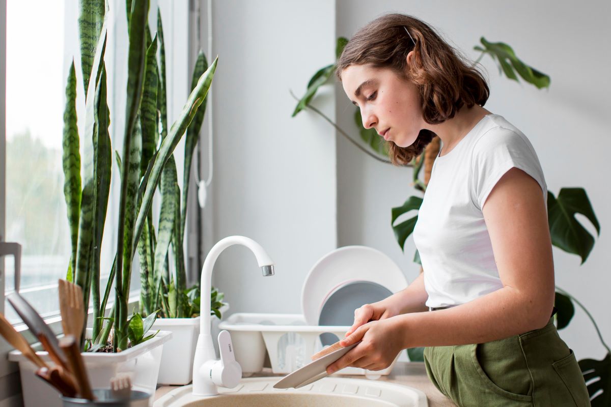 Poate deja ai obiceiul să cureți chiuveta după ce speli vasele – dar știai că ar trebui să o cureți și înainte? Astfel elimini orice urmă de mâncare sau grăsime înainte de a pune vasele la spălat, evitând contactul cu bacterii suplimentare.