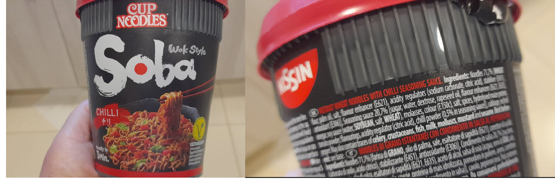 Imaginea acestui produs ne sugerează niște tăieței soba chinezești cu legume și chilli. Pare un produs sănătos și comod de preparat. Adaugi apă, tăiețeii sunt prefierți, legumele deshidratate. Situația se schimbă când rotim cutia. Produsul conține 5 E-uri, zahăr adăugat, legume nu există, are un sos alcătuit pe principiile chimiei elaborate. Numele real al produsului este: Tăieței instant din făină cu sos aromatizat cu chilli. Nicio asiatică nu ar da copilului așa ceva. Dar copilul meu e mort după ei, îi cumpără când scapă singur la cumpărături.