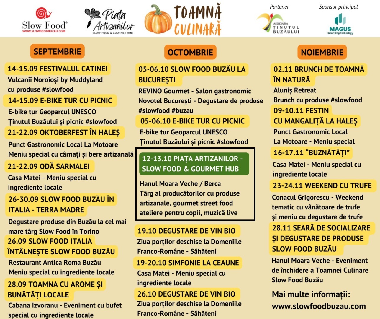 Evenimentul de referință va fi cea de-a 5-a ediție a Pieței Artizanilor, organizată pe 12-13 octombrie la Slow Food & Gourmet Hub din Berca, unde producătorii locali vor oferi produse autentice de calitate.