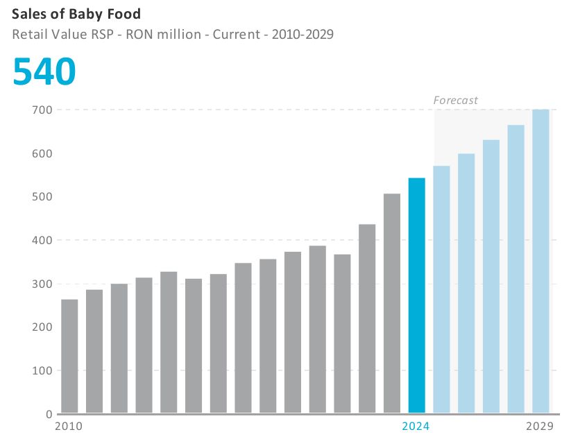 Vânzările din România, în retail și la prețul recomandat de producători, de hrană pentru bebeluși vor fi în 2024 de 540 de milioane de lei, în creștere cu 7% comparativ cu 2023, potrivit raportului „Baby Food in Romania”, realizat de Euromonitor, care a oferit, pentru G4Food, informații cheie din cercetare. Totuși, în volum vânzările sunt în scădere din cauza prețurilor mai mari sau a migrației familiilor tinere.