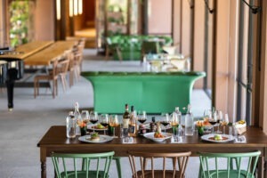 De joi până duminică, de la 11.30 la 17.30, restaurantul oferă preparate proaspete și de sezon, exclusiv din producția proprie, în sistem from farm to fork. De pe terenurile care însumează aproape 400 de hectare și care găzduiesc culturi biologice de cereale, legume, arbori și arbuști fructiferi de multe feluri, viță de vie dar și o crescătorie de porci în sistem semiliber (liberi dar într-un spațiu mare îngrădit). Mâncarea poate fi servită în localul fermei dar și cumpărată din magazinul propriu. Se organizează, firesc, și petreceri de toate felurile.