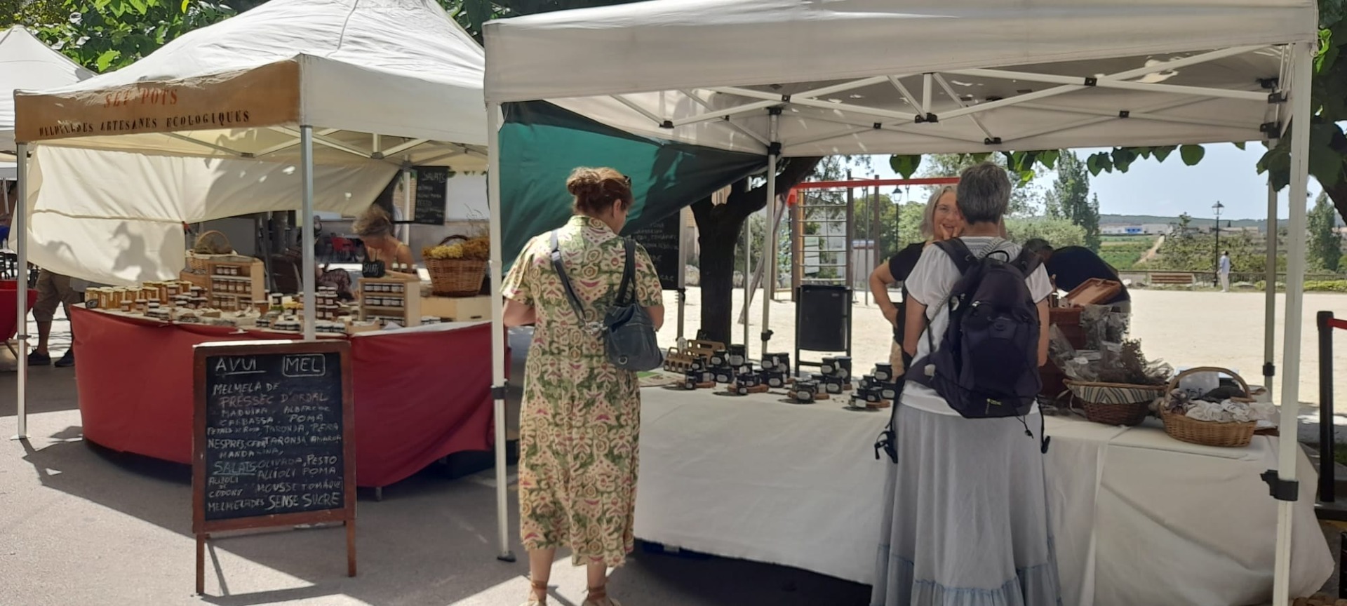 O domnișoară care expune legume și fructe variate, are pe tarabă și dulceață și supă cremă de calcots. Este un soi de ceapă local, seamănă cu ceapa verde, dar e mai groasă. Catalanii o frig pe grătar și o servesc cu un sos de roșii și migdale. O întreb cine le produce. „Legumele care ne rămân le ducem la Sant Boi de Llobregat. Acolo le prelucrează și le comercializăm ulterior”, spune ea. Practic ei transportă și prelucrează materia primă la o fabrică, vânzând-o ulterior sub marcă proprie.