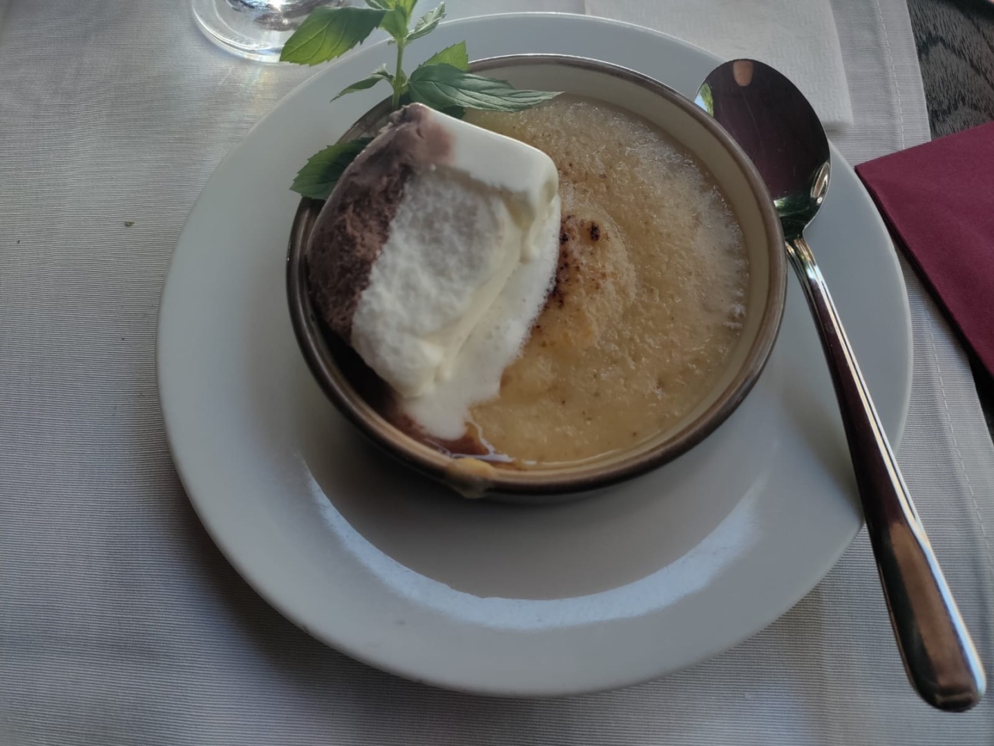 Ca opțiune de desert, el a ales binecunoscuta halva, însă făcută după altă rețetă și servită caldă. Cu lapte, dar și cu o înghețată rece: „O mixtură de temperaturi care oferă o senzație inedită.”
