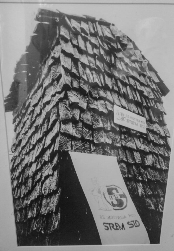 De pe acest acoperiș „afumat” se făcea vânzarea în târg. Sârbii au creat apoi în ’94 „Cuțitul măcelarului”, un sătâr din 1.800 de table de slănină. În 1995, Slaninijada a surprins lumea cu o mașină de tocat carne construită din 2.000 de table de slănină.