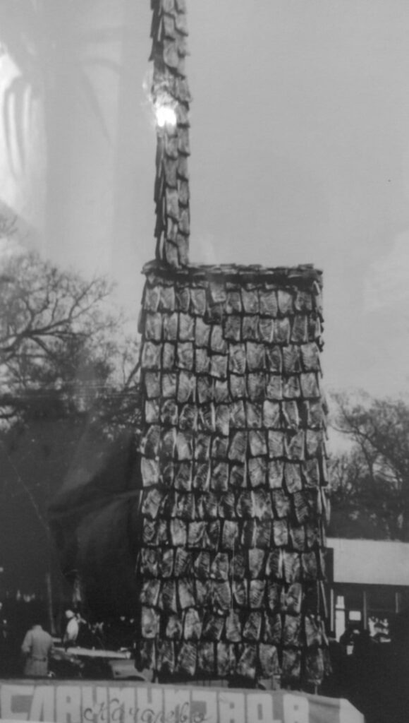 A urmat în ’93 o casă din slănină, înaltă de 25 metri și lată de trei metri, cu un acoperiș din 1.800 de table mari de slănină, înșirate ca țiglele de pe casele bănățenilor.