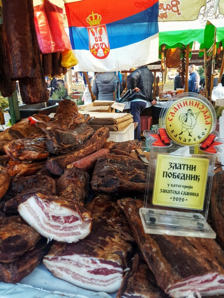 „Trailere, furgonete și mașini au fost încărcate cu peste 100 de tone de slănină și 400 de tone de produse tradiționale sârbești, precum cârnați afumați, jamboane maturate, afumături, jumări, tobă și boia, aduse de micii și marii producători din toate regiunile Serbiei”, a declarat Ramona Rista, diplomat culinar.