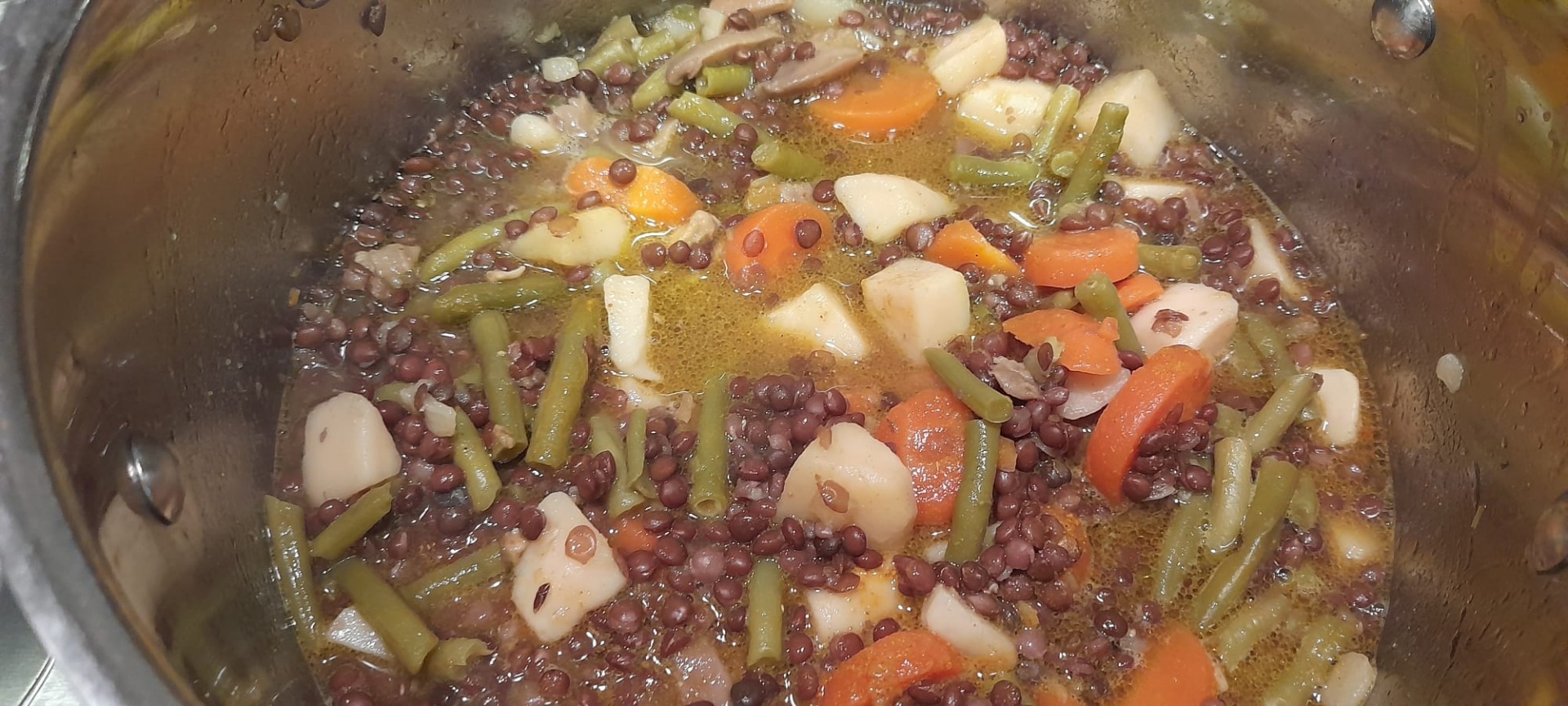Dacă avem în casă o conservă cu multe legume fierte (eu am avut una gen ghiveci, cu cartofi, morcovi, fasole verde, ardei) și un borcan de linte, supa noastră este gata în 10-15 minute.
