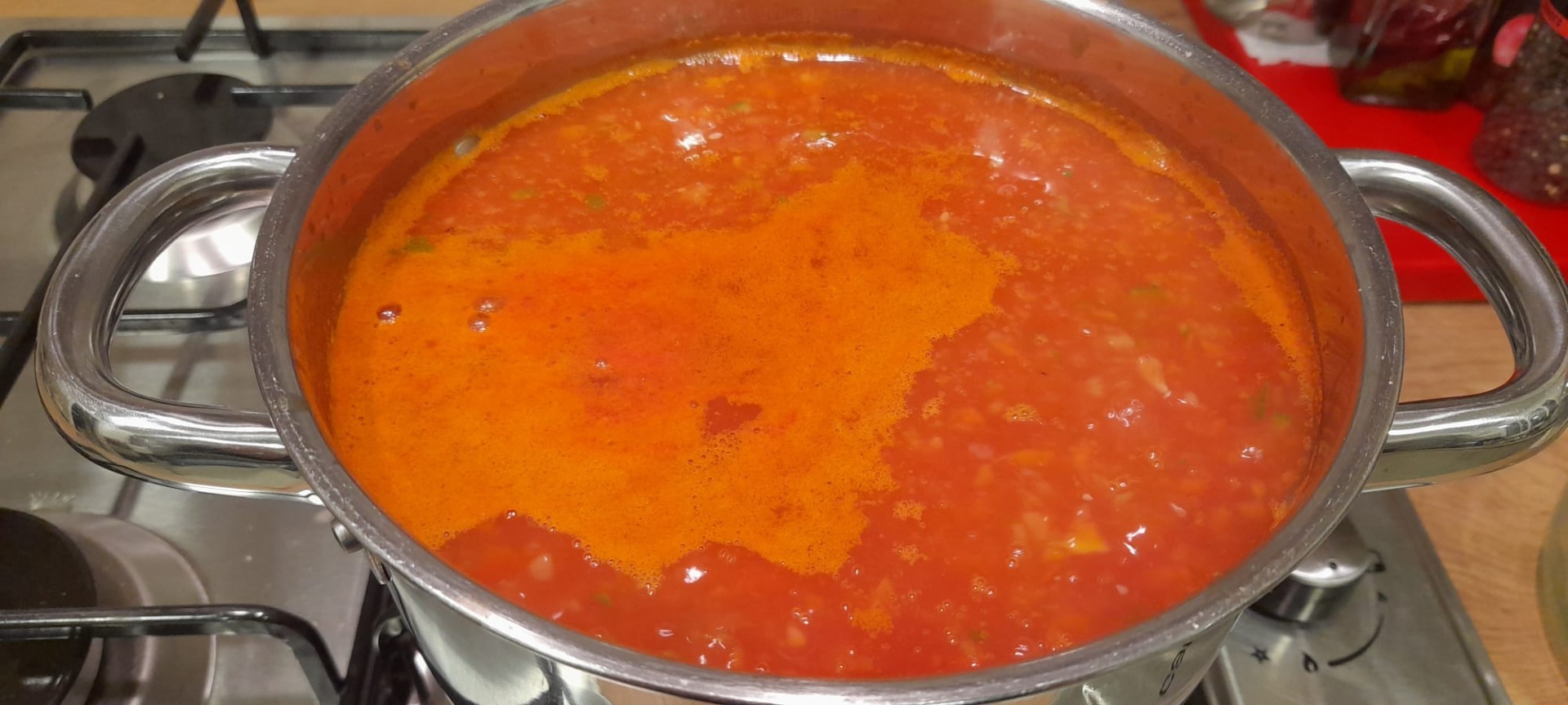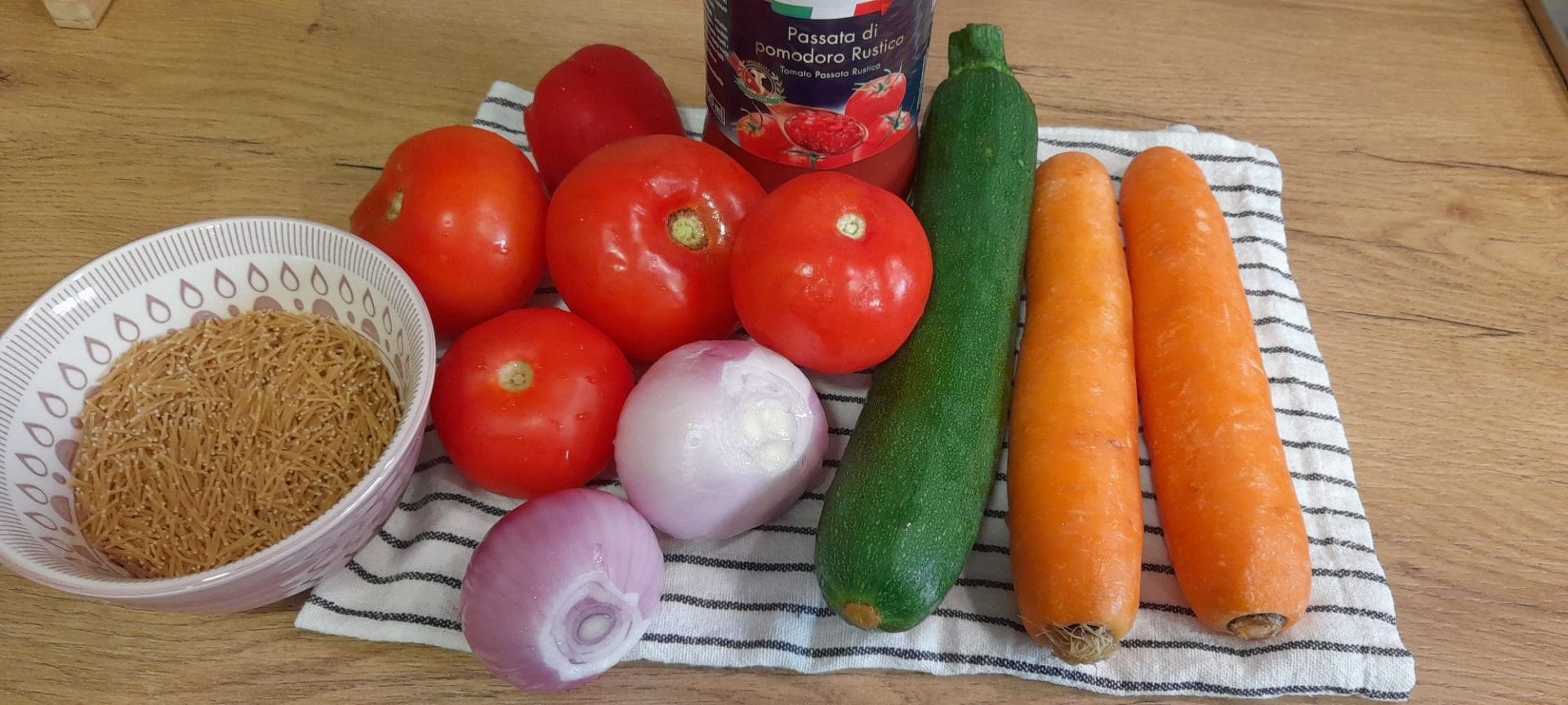 Am dat roșiile pe răzătoare și le-am pus peste legume, am pus și passata. Am adăugat un litru de apă, sare, piper și am mai fiert 10 minute. În ultimele minute am pus și fideaua.