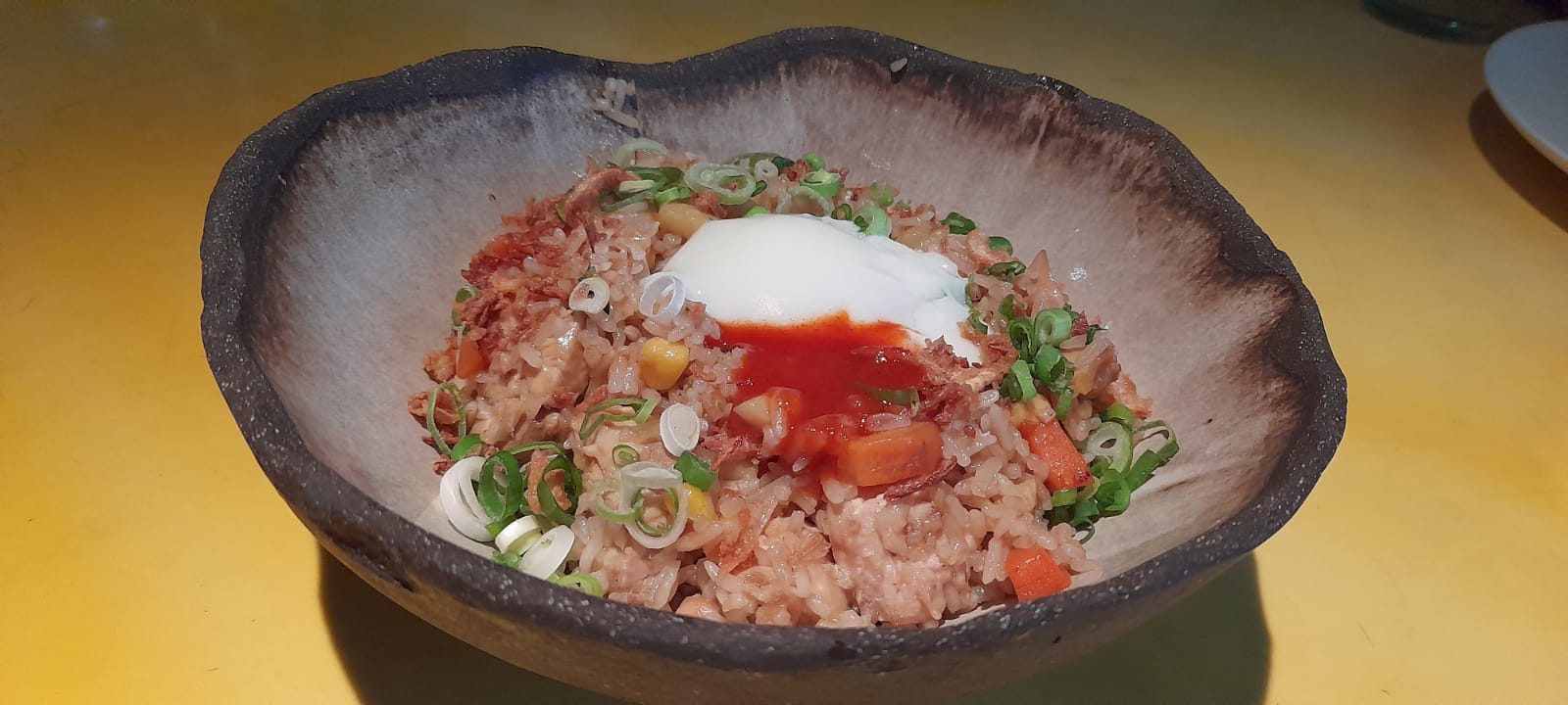 Ultimul fel am comandat un yakimeshi, un stir-fried rice cu pui, legume, kimchi, ceapă verde și un ou deasupra. Oul fiind gătit la temperatură joasă. Peste care se pune un sos yakimeshi.