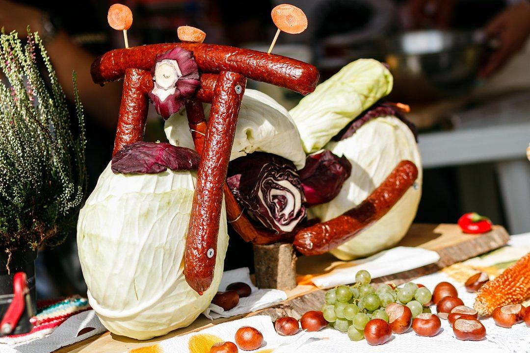 Este vorba despre o motocicletă realizată din varză (roțile), cârnați (cadru), morcovi (vitezometru și oglinzi) și ceea ce pare a fi varză chinezească (șaua).