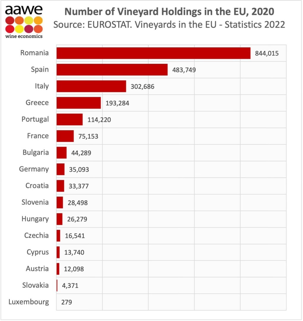 Cu 844.015 exploatații viticole, România se află pe locul 1 în Uniunea Europeană (UE) la acest capitol, fiind urmată de Spania, Italia și Grecia, potrivit unui infografic, bazat pe date Eurostat, prezentat de American Association of Wine Economists (AAWE).