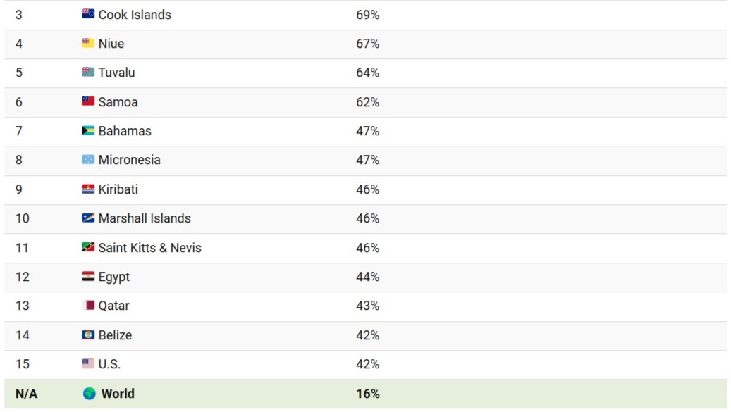 Publicația a realizat lista țărilor cu cele mai ridicate rate ale obezității la adulți folosind indicele de masă corporală (IMC). Datele provin de la Organizația Mondială a Sănătății (OMS), actualizate până în 2022.