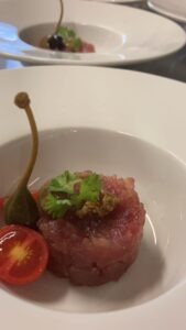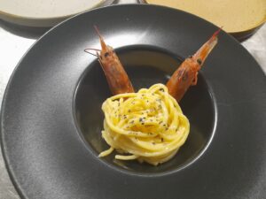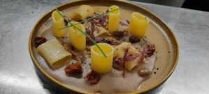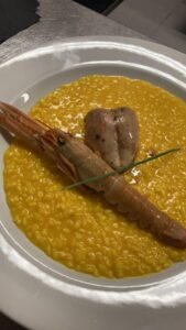 “Meniul este gurmand: printre cele mai populare feluri de mâncare pentru prânz se numără, cu titlu de exemplu, risotto al nero, moscardini alla luciana și praf de tarallo; fish and chips de ombrine in porchetta; bavareisa all’amaretto. Apoi urmează ravioli de dovleac cu unt de alune, guanciale și mostarda de mere; sos Cortefranca și pere Williams; parfait de kaki. Cina începe cu un tartar de ”Blonde d’Aquitaine”, ou, anșoa, capere, muștar, sos worchester. Se mai găsește pappardelle cu ragu de căprioară sau gnocchi cu polenta di storo pe cremă de gorgonzola, apoi se pot bucura de un file de vită în stil Voronoff cu morcovi à la parisienne.