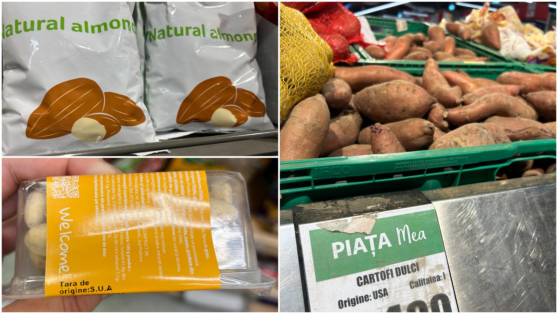 De la rafturile de fructe confiate și felurite nuci, o altă oprire cu șanse mari de reușită e la raionul de legume: importurile de cartof dulce din Statele Unite sunt în creștere în ultimii ani, la 1,65 milioane de dolari în 2023, cu un salt spectaculos la început de 2024, conform comparațiilor statisticilor pe primele 3 luni de anul trecut și de anul acesta. Nu o să găsiți cartof dulce American peste tot, dar dacă găsiți, merită să-l încercați! În două dintre hypermarketuri se găsea cartof dulce „made in USA”, în al treilea leguma era produsă în Egipt.