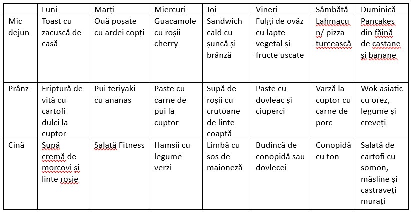 Mai jos aveți meniul pe care vi-l propunem pentru săptămâna 27 octombrie – 2 noiembrie.