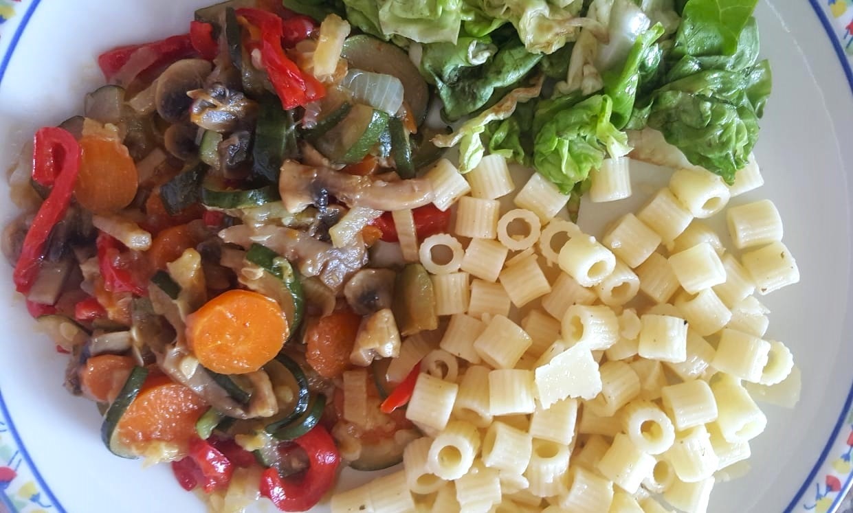 E gata în mult mai puțin de 1h: pentru aceste legume sotate servite cu paste, într-o tigaie sotăm legumele, orice combinație avem la îndemână, într-o oală separat fierbem pastele, salata o condimentăm separat într-un bol și cam asta e tot.