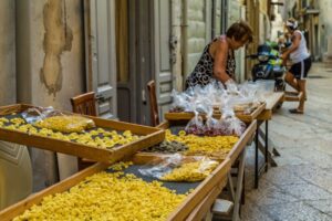 Pe străzile din centrul vechi din orașul Bari, capitala regiunii Puglia, de mult timp femeile scot, fiecare, pe trotuar o masă cu un scaun și aluatul gata pregătit, și cu ajutorul unui cuțit fac paste în grup. Se numesc orecchiette pastele locului, iar de câtva timp municipalitatea a pornit o bătălie pentru intrarea acestui tip de producție în legalitate.