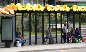 refugiile-din-statiile-de-autobuz-din-craiova-decorate-cu-fructe-gigant foto: gds.ro