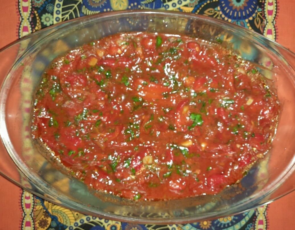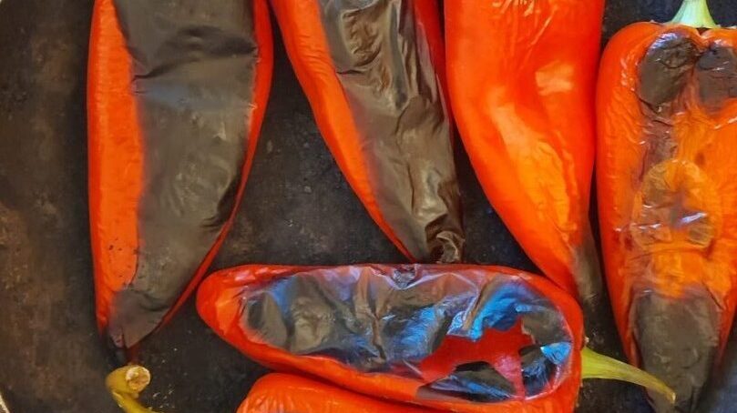 Ardeii se coc pe grătar sau pe aragaz, într-o tigaie mai veche, pe care nu v-ați îndurat să o aruncați. Pe măsură ce se coc, se pun într-un vas, presărați cu sare, și se țin acoperiți, ca să fie mai ușor de curățat. Se îndepărtează apoi coaja, se spală de sâmburi și se lasă într-un castron, rupți în fâșii și având grijă să păstrați, pe cât se poate, zeama pe care o lasă. Între timp, roșiile se taie cubulețe, iar usturoiul se toacă mărunt și se călesc împreună într-o tigaie, în ulei. Când sunt aproape gata, se adaugă și ardeii copți cu tot cu zeama lor, pasta de roșii, sarea, oțetul balsamic și zahărul. Se lasă tot amestecul să fiarbă la foc mic câteva minute, până când mâncarea capătă o textură cremoasă. După ce oprim focul, adăugăm pătrunjelul tocat și asta e tot.