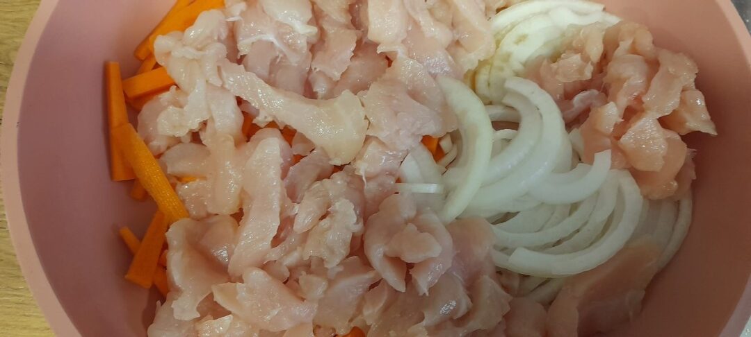 Am tăiat carnea în fâșii subțiri, ceapa în rondele, legumele în bastonașe. Se pun în tigaie câteva linguri de ulei de măsline și, daca aveți, două linguri de ulei de susan, carnea, ceapa, morcovii și condimentele. Daca aveți varză puneți-o tot acum tăiată fideluță subțire. Se prăjesc la foc rapid câteva minute, se pun 5-6 linguri de sos de soia și se continuă gătirea până când carnea este aproape gata. Se adaugă frunzele de bok choy tăiate fâșii. Legumele trebuie să rămână crocante, iar carnea să fie gătită.