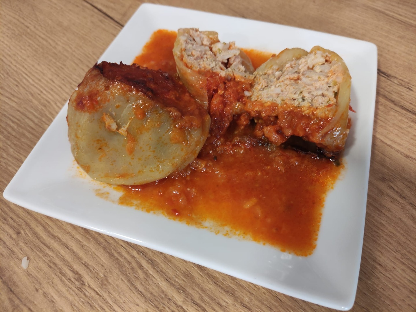 Eu am avut azi la masă familia lărgită, cum vă spuneam, așa că am preparat mâncarea în cea mai mare cratiță pe care o am. Au ieșit 18 ardei, din cei mici, verzi, românești. Am găsit din fericire la magazinul românesc din vecinătate. Sunt buni și cei spanioli, dar sunt foarte mari, cei românești parcă se coc mai bine, au și coaja mai subțire.