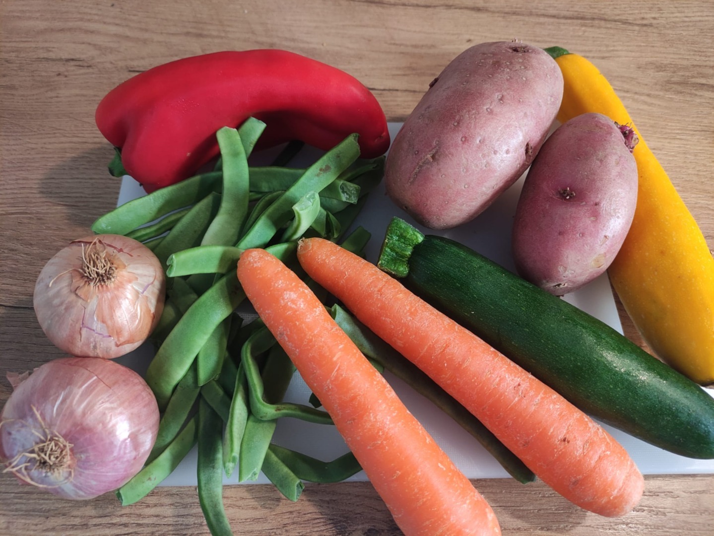 Se taie mărunt ceapa, ardeii, dovleceii și rădăcinoasele (eu le-am tocat cu blender-ul). Se călesc în 2-3 linguri ulei, până se rumenesc puțin. Între timp se pune carnea la fiert cu sare și piper. După 5-10 minute se spumează carnea, se adaugă legumele, cartofii curățați și fasolea curățată și ruptă în bucățele mici. Mai bine o rupeți decât să o tăiați ca să vedeți dacă are ațe.