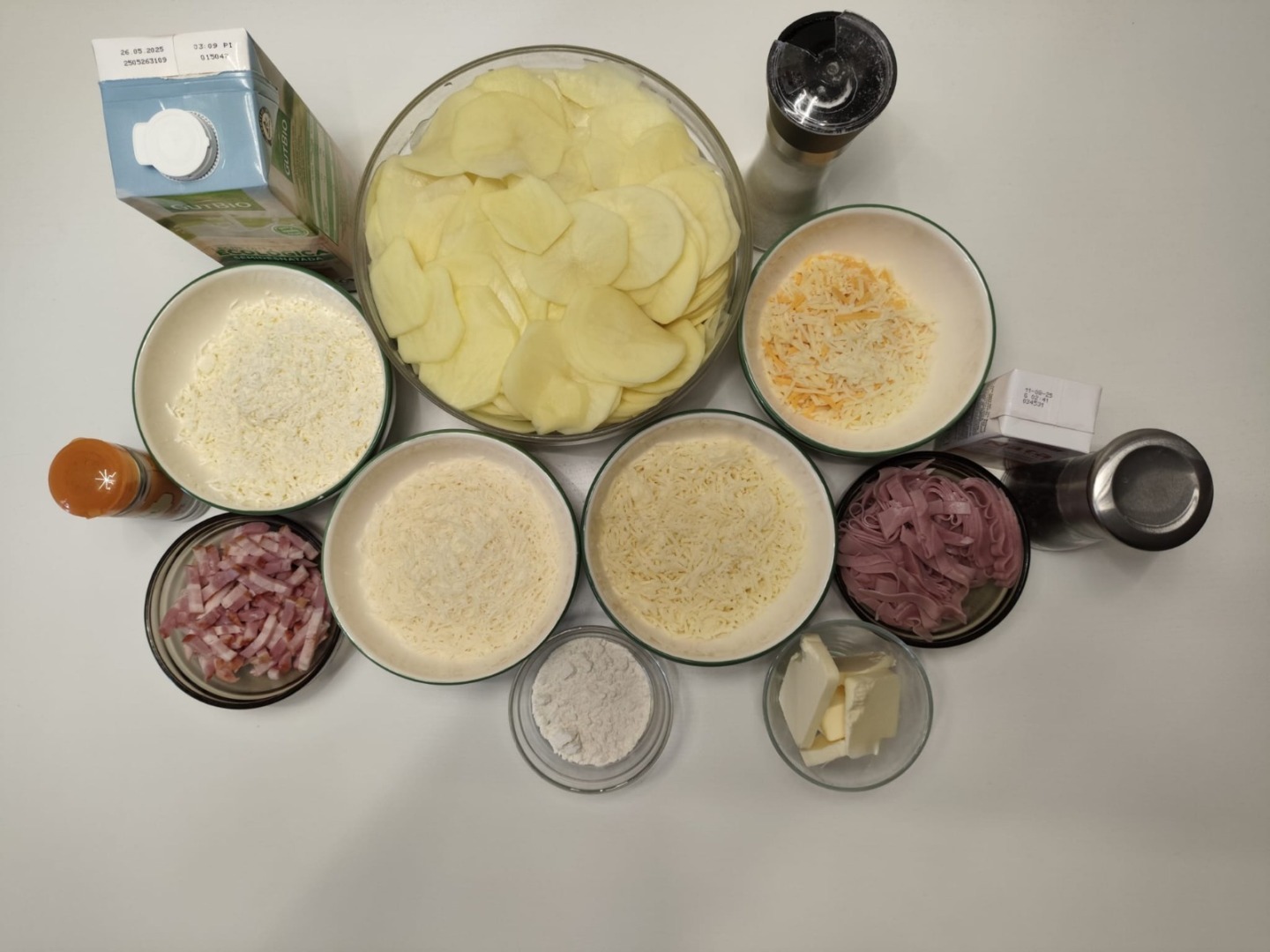 - Am uns cu unt o tavă de cuptor și am pus un strat de cartofi, unul de șuncă și bacon și un nou strat de cartofi. Am turnat deasupra sosul pe care l-am lăsat să ajungă în toată tava, până la fund. Deasupra am presărat restul de brânză pentru gratinat.
