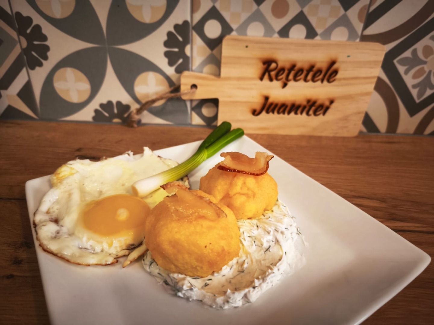 Servim 1-2 crochete cu sos de smântână, un ou ochi sau poșat și ceapă verde.