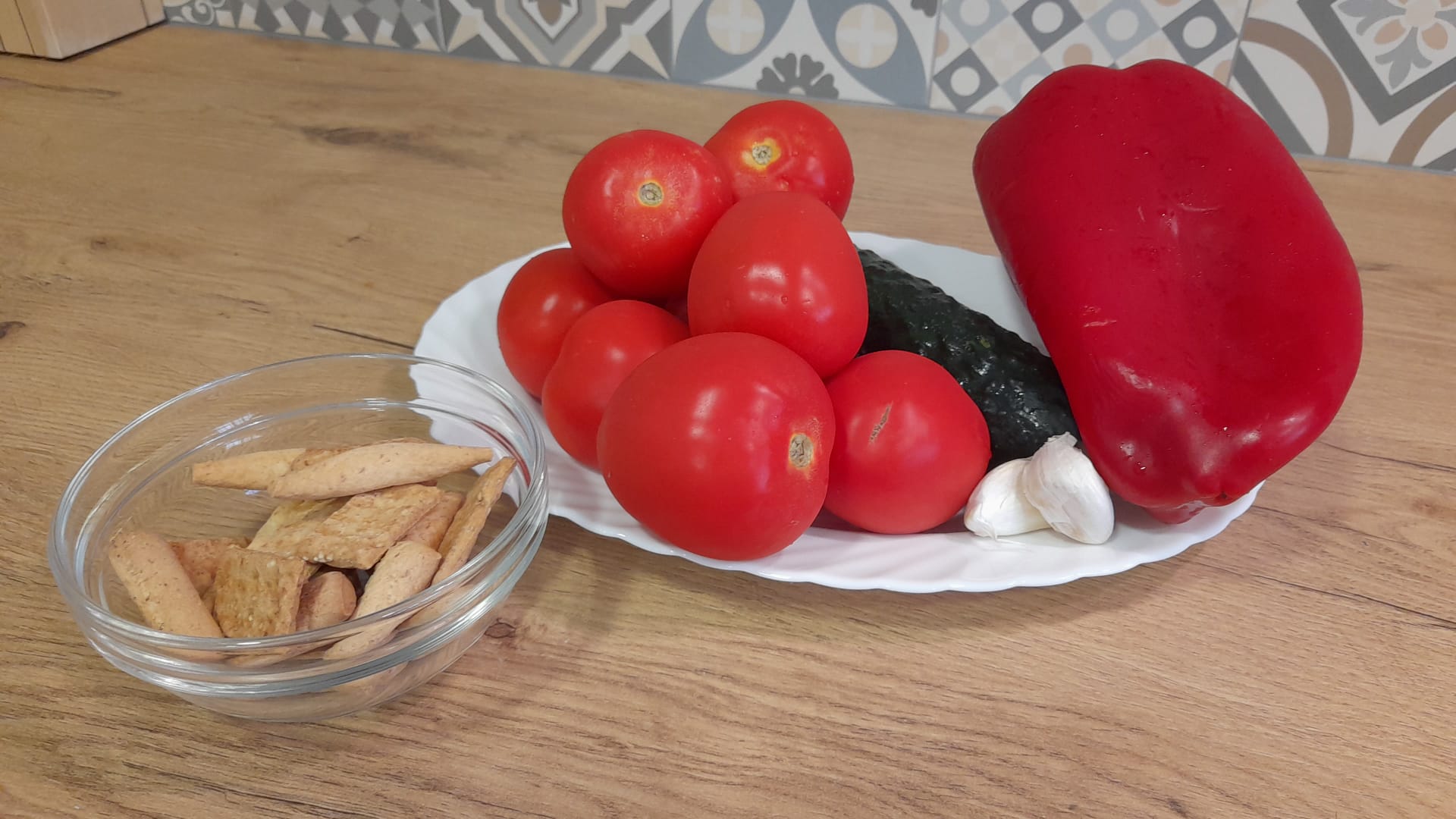 Roșiile se curăță de cotoare, se taie în sferturi. Ardeiul se fragmentează în bucăți mari după ce am înlăturat cotorul și sâmburii. Am tăiat castravetele în bucăți fără a-l curăța de coajă. Am curățat usturoiul și am rupt pâinea în bucăți.