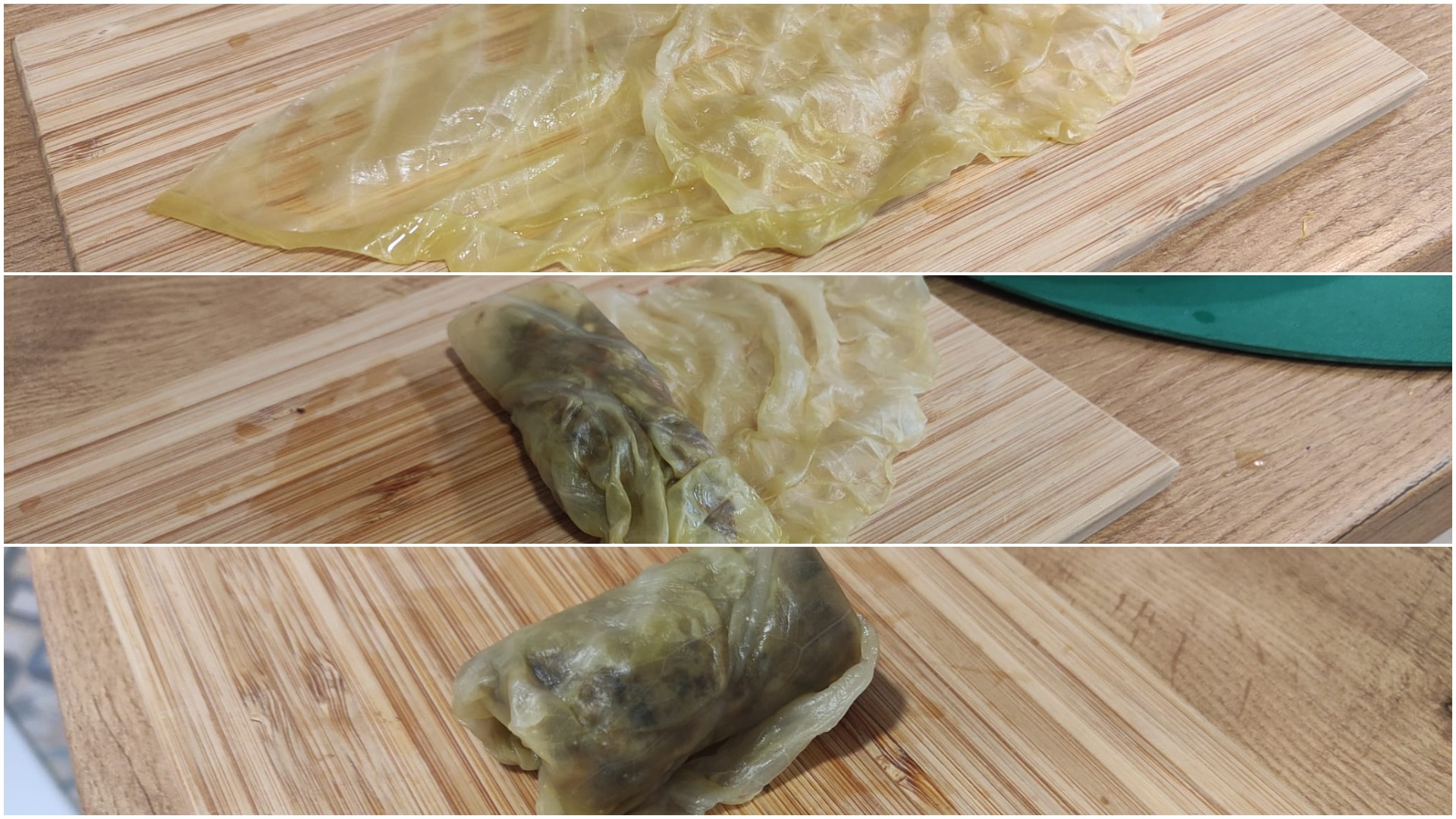 Se pune compoziția în partea de jos a foii așezată cu partea mai lungă orizontal. Se rulează și se introduc în interior capetele. La început e puțin greu, dar după 2-3 „ture” de sarmale va fi floare la ureche.