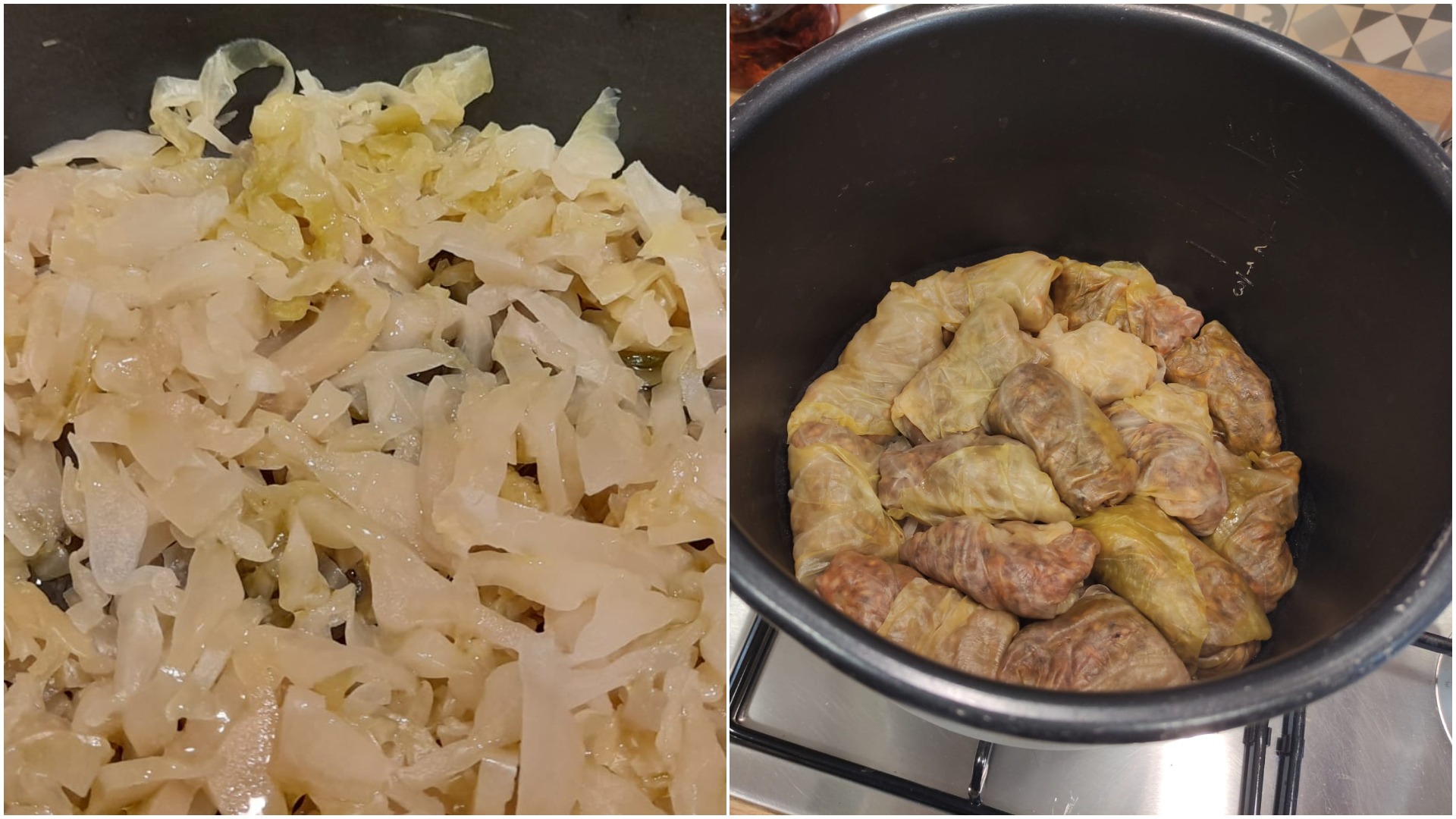 Lăsăm deoparte compoziția și tăiem frunzele. Varza se pune în apă pentru o oră-două, Se scurge și se taie, fiecare frunză în 2 sau 3 bucăți.