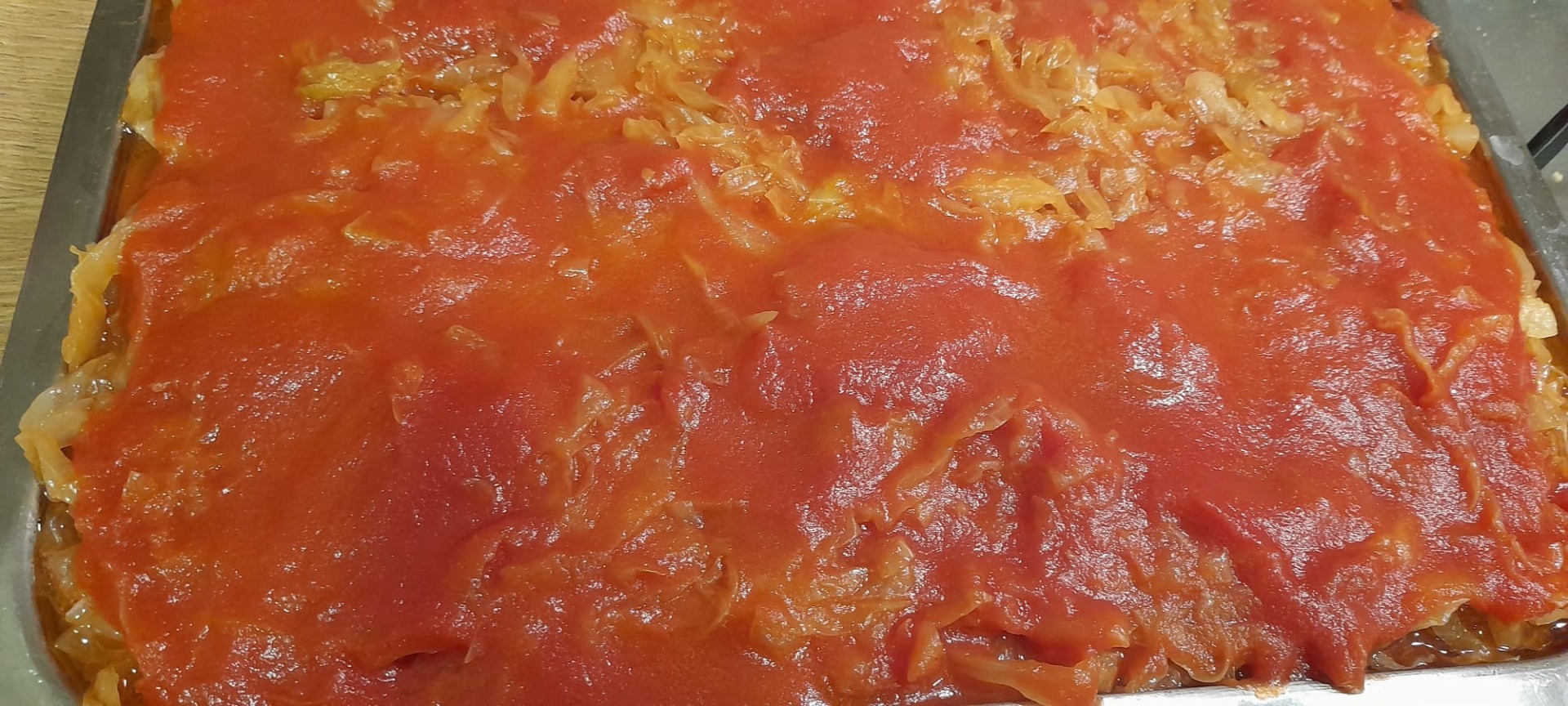 Și în final restul de varză. Deasupra am pus bulionul, zeama lăsată de varză și ceva apă până la marginea tăvii.