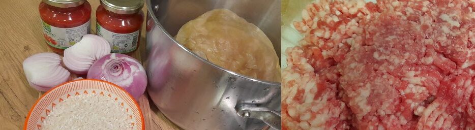 Am tocat mărunt ceapa și am călit-o în ulei de măsline. Ulterior se adaugă și carnea, sare, piper și condimente. Fiecare pune ce-i place (cimbru, dafin etc.). Eu pun enibahar măcinat (cam două lingurițe) și boia dulce de ardei. Separat am pus orezul la fiert (raportul orez : apă este 1 la 3, nu uitați să puneți sare). Am tăiat varza fideluță subțire. Am pus și ceva boia dulce și am călit-o în ulei de măsline până s-a înmuiat. Eu folosit varză murata, mi-ar fi plăcut mai mult varza dulce , dar aveam mofturoși la masă care așa au cerut.