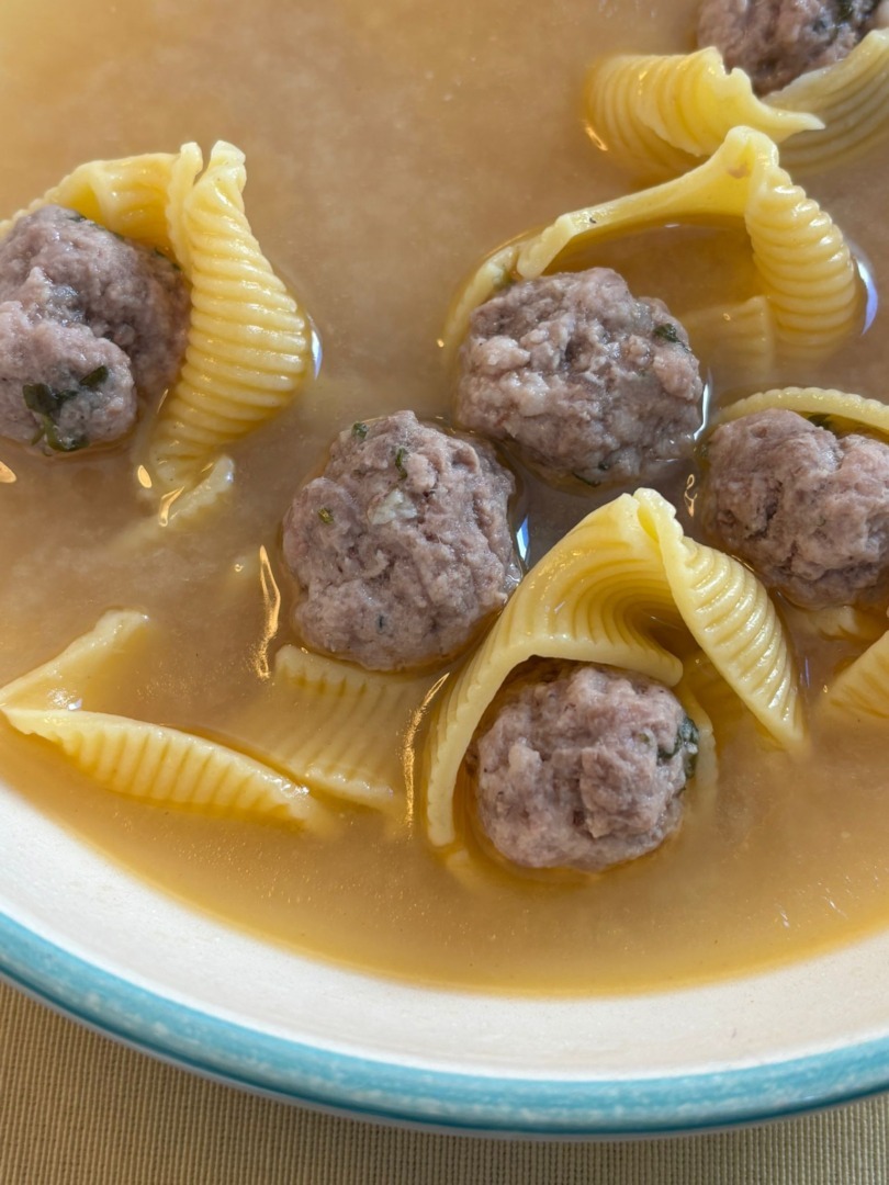 Prepararea chiftelelor: Se omogenizează carnea tocată cu o felie de pâine înmuiată în lapte sau 2 linguri de pesmet, sare, piper și nucșoară. Se pune carnea într-un posh și se umplu pastele cochilie sau se pregătesc biluțe mici. Se pun în supa care clocotește și se fierb până când carnea este gătită.