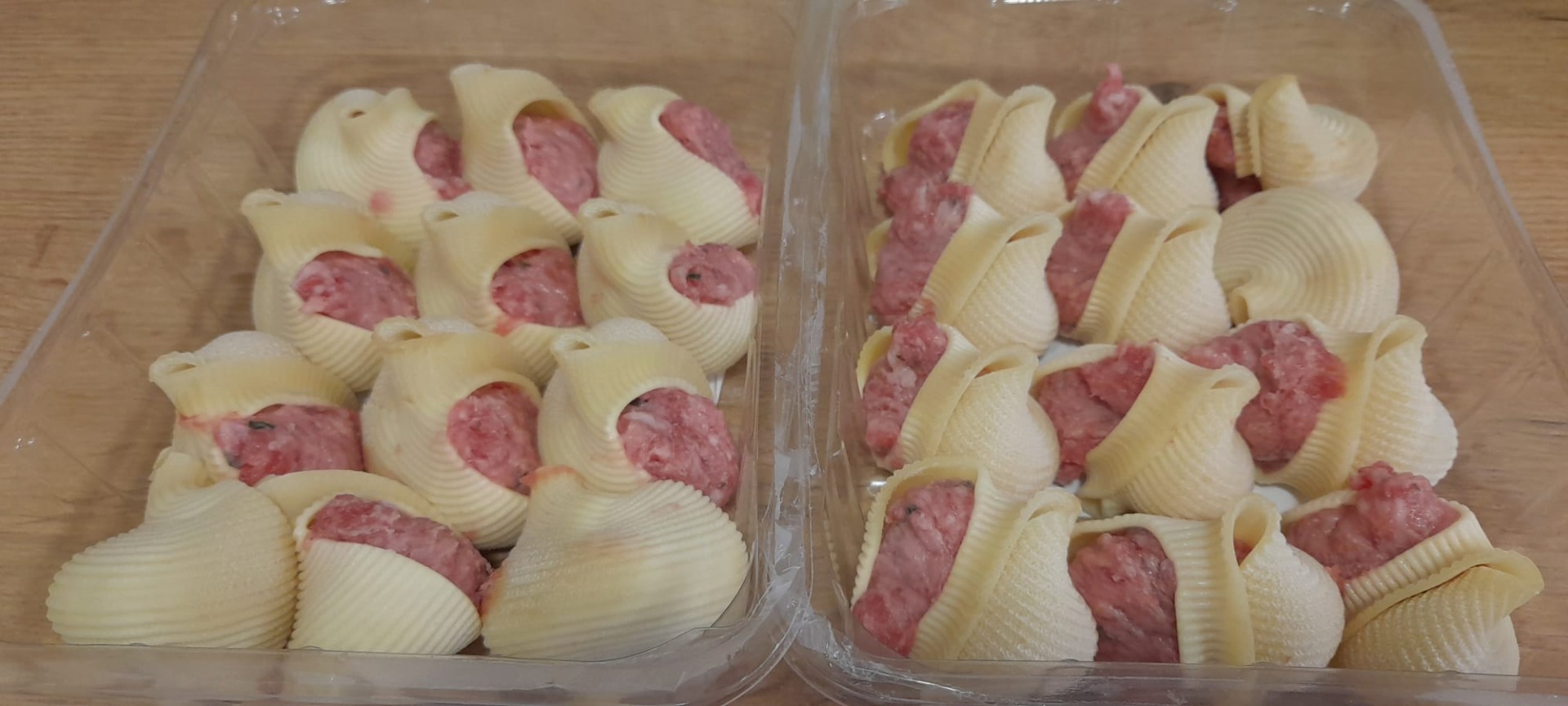 Pentru chifteluțe folosim pasăre, vită sau porc, ori amestec, pe gustul fiecăruia. Mai avem nevoie de un pachet de paste, în Catalonia se folosesc niște melci mari care se umplu cu carne fiind 2 în 1 paste umplute cu carne de chiftele.