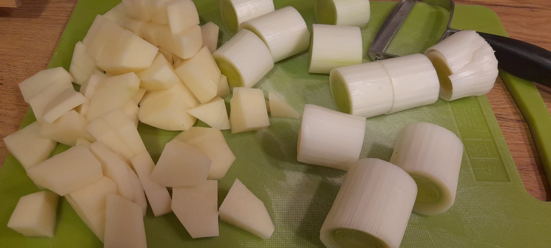 Prazul se taie în felii foarte fine (eu l-am băgat la blender). Se folosește doar partea albă. Cartofii se curăță și se taie în bucățele mici.