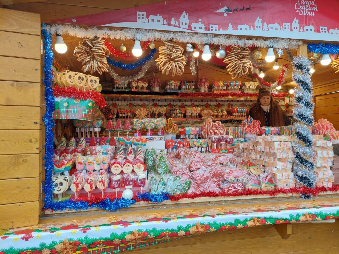 Mai puțin rahatul, care este adus chiar din Turcia. Vedeta standului de dulciuri este cotroversata ciocolată Dubai, care are la Târgul de Crăciun prețul de 30 de lei pe suta de grame. Este cel mai scump produs al căsuței. Dar produsele pe care le recomandă cu tot dragul sunt doboșul și prăjitura albinița, la care sunt folosite rețelete originale. Prețurile se învârt în jurul sumei de 10 lei suta de grame. Bomboanele fondante arată și ele apetisant.